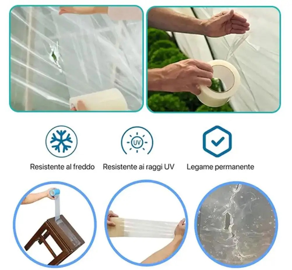 Якщо плівка на теплиці порвалась чи потріскалася, скотч дозволяє оперативно закрити отвори, тріщини або дефекти, зберігаючи тепло і вологість усередині.